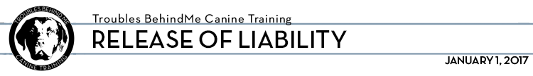 I hereby release and agree to save and hold harmless, Troubles Behind Me Canine Training, William Drescher, any affiliates or property owners from any and all liability, claims, suits, actions, loss, injury, or damage of any nature or kind, or for any liability, claims, suits, actions, loss, injury or damage which I or my dog(s) may sustain or which may be caused in any way by my dog(s). I specifically, without limitation, agree to fully indemnify Troubles Behind Me Canine Training, William Drescher any affiliates or property owners for any and all such liability, claims, suits, actions, losses, injury, or damage. I understand that I am solely financially responsible for any damage or harm caused by my dog during training, boarding, socializing, or walking.